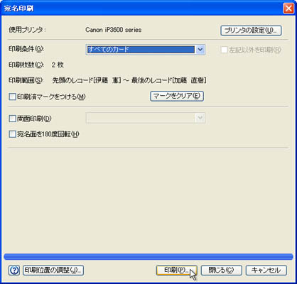 [印刷条件(G)]の▼をクリックして、「すべてのカード」を選択し、[印刷(P)]ボタンをクリックします。![]() |