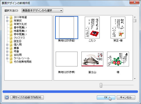 「年賀状」フォルダを選択した状態で、[無地(はがき縦)]をクリックし、[OK]ボタンをクリックします。 ※フォルダは、用途に応じて選択してください。 ![]() |