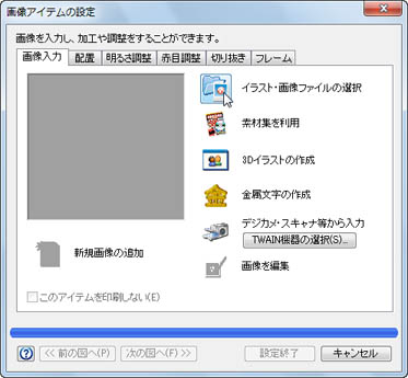 「画像入力」タブをクリックし、[イラスト・画像ファイルの選択]ボタンをクリックします。![]() |