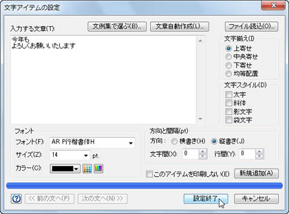 [方向]の[横書き(H)]または[縦書き(J)]をONにして、[設定終了]ボタンをクリックします。![]() |