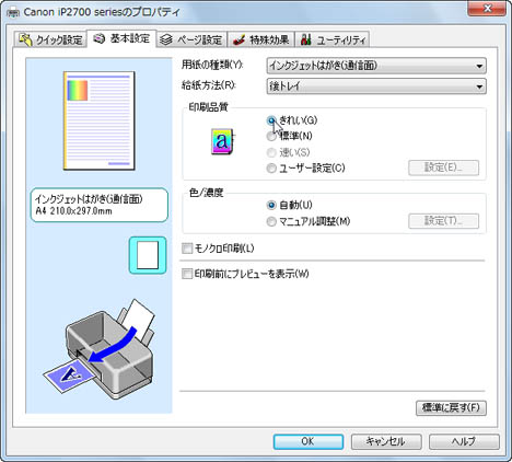 「基本設定」タブをクリックし、[用紙の種類(Y)]の一覧から目的の用紙の種類を選択します。 | ||||||||||||||||||||