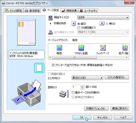 「ページ設定」タブをクリックし、[用紙サイズ(Z)]の一覧から「はがき」を選択して、[OK]ボタンをクリックします。![]() |