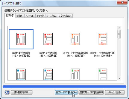 [年賀はがき(縦)148×100(縦書)]をクリックし、[全カードに割当(A)]ボタンをクリックします。![]() |
