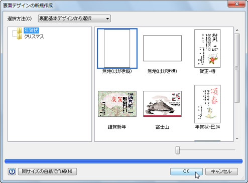 「年賀状」フォルダを選択した状態で、[無地(はがき縦)]をクリックし、[OK]ボタンをクリックします。 ※フォルダは、用途に応じて選択してください。 ![]() |