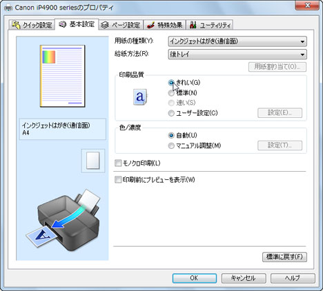「基本設定」タブをクリックし、[用紙の種類(Y)]の一覧から目的の用紙の種類を選択します。 | ||||||||||||||||||||