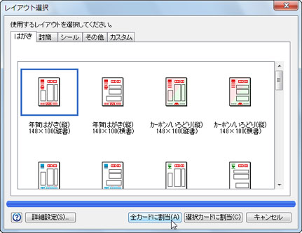 [年賀はがき(縦)148×100(縦書)]をクリックし、[全カードに割当(A)]ボタンをクリックします。![]() |