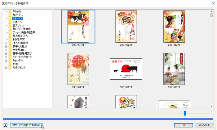 「フォーマル」フォルダを選択した状態で、縦型のハガキをクリックし、左下の[同サイズの白紙で作成(N)]ボタンをクリックします。![]() |