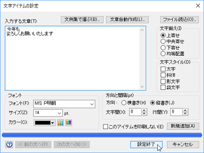 [方向]の[横書き(H)]または[縦書き(J)]をONにして、[設定終了]ボタンをクリックします。![]() |