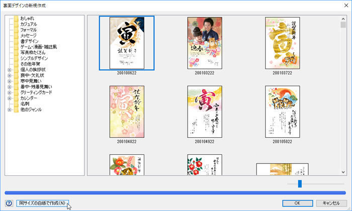 「フォーマル」フォルダを選択した状態で、縦型のハガキをクリックし、左下の[同サイズの白紙で作成(N)]ボタンをクリックします。![]() |