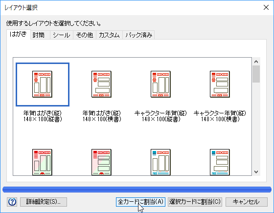 [年賀はがき(縦)148×100(縦書)]をクリックし、[全カードに割当(A)]ボタンをクリックします。![]() |