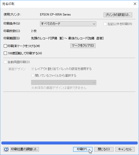 [印刷条件(G)]のVをクリックして、「すべてのカード」を選択し、[印刷(P)]ボタンをクリックします。![]() |
