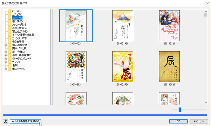「フォーマル」フォルダを選択した状態で、縦型のハガキをクリックし、左下の[同サイズの白紙で作成(N)]ボタンをクリックします。![]() |