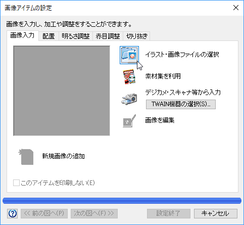 「画像入力」タブをクリックし、[イラスト・画像ファイルの選択]ボタンをクリックします。![]() |