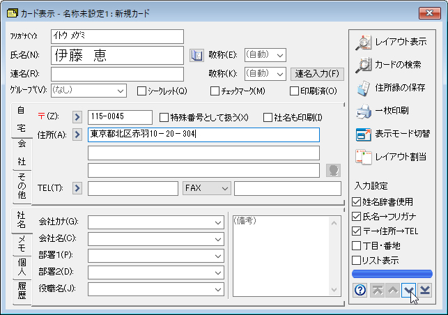 [氏名(N)]に宛先の氏名を入力します。[フリガナ(Y)]にフリガナが自動で入力されますので、必要に応じて修正を行います。 | ||||||||||||||||||||