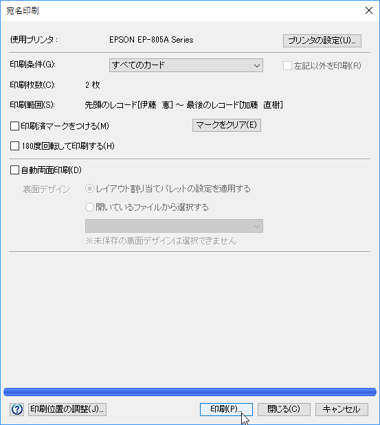 [印刷条件(G)]のVをクリックして、「すべてのカード」を選択し、[印刷(P)]ボタンをクリックします。![]() |
