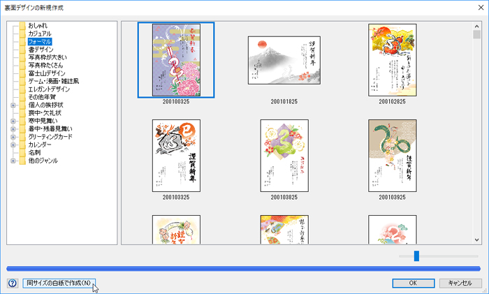 「フォーマル」フォルダを選択した状態で、縦型のハガキをクリックし、左下の[同サイズの白紙で作成(N)]ボタンをクリックします。![]() |