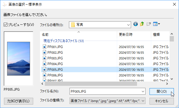 目的の画像を選択し、[開く(O)]ボタンをクリックします。![]() |