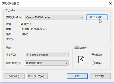 [プリンター名(N)]でプリンタを選択し、[プロパティ(P)]ボタンをクリックします。![]() |