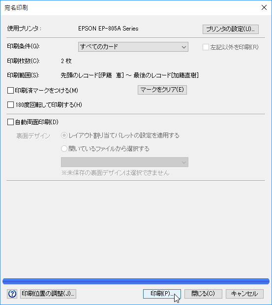 [印刷条件(G)]のVをクリックして、「すべてのカード」を選択し、[印刷(P)]ボタンをクリックします。![]() |
