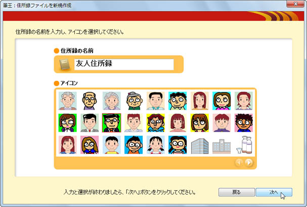 住所録の名前を入力し、アイコンを選択して、[次へ]ボタンをクリックします。![]() |