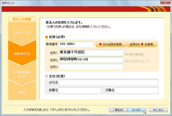 差出人の氏名を姓と名に分けて入力し、[次へ(N)>]ボタンをクリックします。 | ||||||||||||||||||