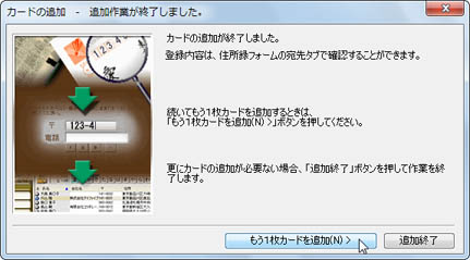 [もう1枚カードを追加(N)>]ボタンをクリックして、他の宛先を入力します。終わったら[追加終了]ボタンをクリックします。