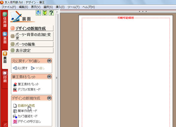画面左端の「裏面」タブをクリックし、左側上部にある「デザインの新規作成」をクリックして、中段に表示された[デザインの新規作成]の「白紙から作成」をクリックします。![]() |