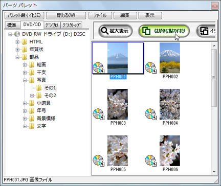 画面左上の「DVD/CD」タブをクリックし、フォルダの左の[+]をクリックして、目的のデータが保存されているフォルダを表示します。目的の画像を選択して、[はがきに貼り付け]ボタンをクリックし、[閉じる(W)]ボタンをクリックします。![]() |