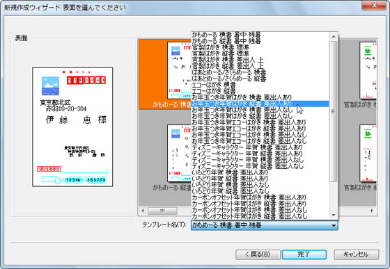 はがきの種類を選択し、[完了]ボタンをクリックします。![]() |