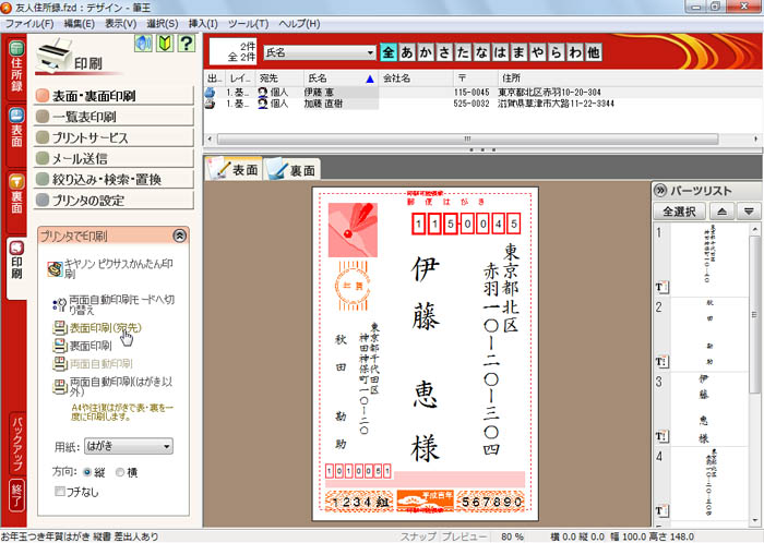 | 宛名面を印刷するには、次のように操作します。 ※ここでは、Canon製のプリンタ「PIXUS iP4830」を例に解説します。なお、ドライバのインストールなどの準備はすでに終了し、プリンタが利用できる状態にあることとします。 |