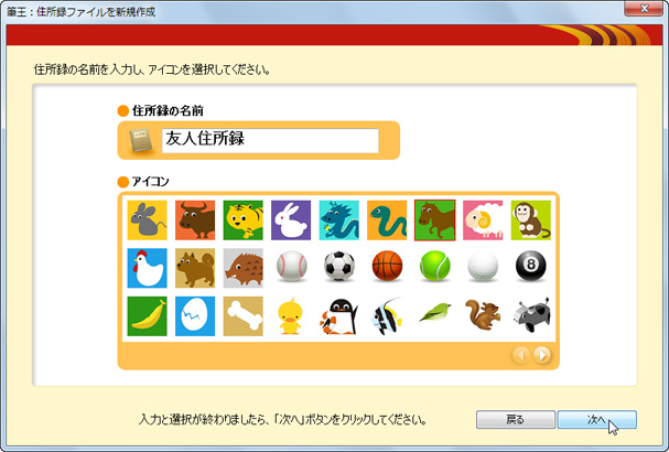 住所録の名前を入力し、アイコンを選択して、[次へ]ボタンをクリックします。![]() |