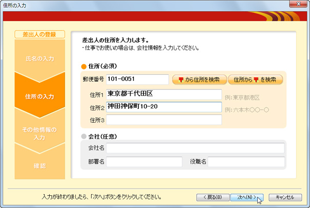 番地を入力し、[次へ(N)>]ボタンをクリックします。![]() |
