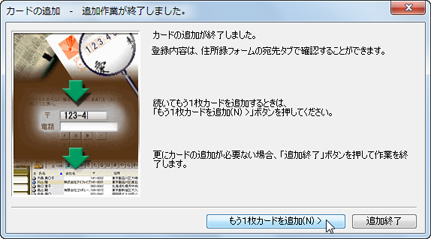 [もう1枚カードを追加(N)>]ボタンをクリックして、他の宛先を入力します。終わったら[追加終了]ボタンをクリックします。