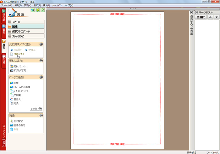 画面左端の「裏面」タブをクリックし、左側上部にある「編集」をクリックして、中段に表示された[元に戻す/やり直し]の「白紙にする」をクリックします。![]() |