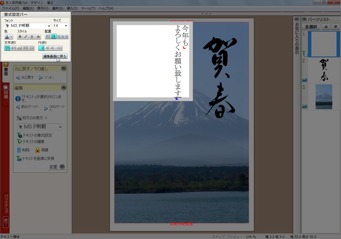 「書式設定バー」のフォントを選択し、文字のサイズを選択して、[配置]のボタンで縦書きか横書きかを選択し、はがき内に表示された入力欄をクリックして文字を入力します。入力が終わったら、[編集画面に戻る]ボタンをクリックします。![]() |