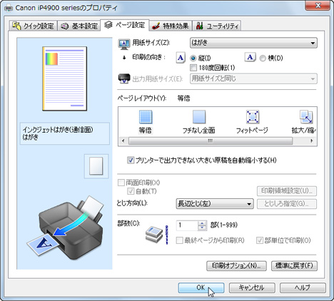 「ページ設定」タブをクリックし、[用紙サイズ(Z)]の一覧から「はがき」を選択して、印刷の向きを設定し、[OK]ボタンをクリックします。![]() |