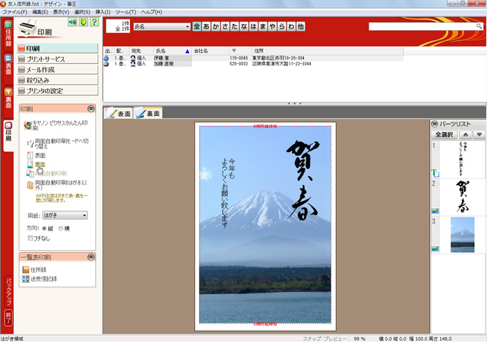 | 宛名面を印刷するには、次のように操作します。 ※ここでは、Canon製のプリンタ「PIXUS iP4930」を例に解説します。なお、ドライバのインストールなどの準備はすでに終了し、プリンタが利用できる状態にあることとします。 |