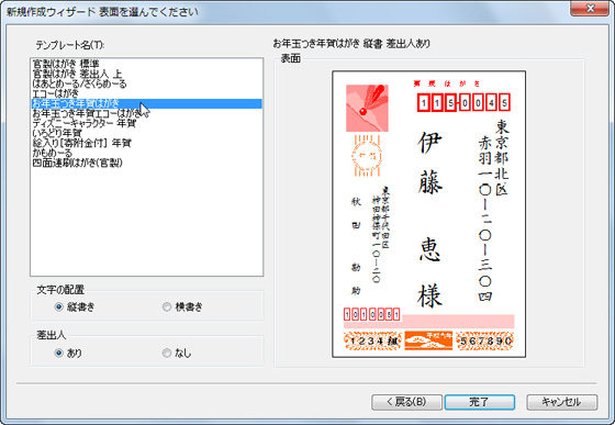 はがきの種類を選択し、[完了]ボタンをクリックします。![]() |