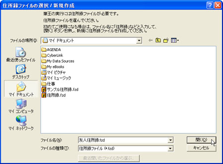 [ファイルの場所(I)]で住所録の保存先を指定し、[ファイル名(N)]に住所録のファイル名を入力して、[開く(O)]ボタンをクリックします。![]() |