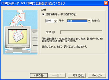 [送信情報をカードに記録する(K)]をONにし、年とハガキの種類を選択して、[完了(F)]ボタンをクリックします。![]() |