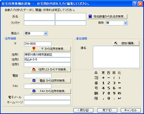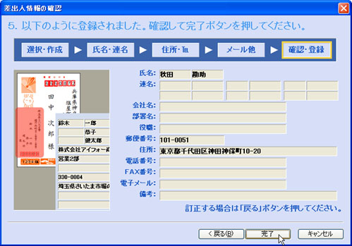 [氏名]に宛先の氏名を入力し、[完了(F)]ボタンをクリックします。 | ||||||||||||||||||