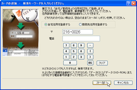 [自宅住所を登録する]をONにして[〒]に郵便番号を入力して、[次へ(N)]ボタンをクリックします。![]() |