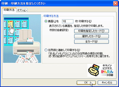 | 宛名面を印刷するには、次のように操作します。 ※ここでは、Canon製のプリンタ「PIXUS IP8600」を例に解説します。なお、ドライバのインストールなどの準備はすでに終了し、プリンタが利用できる状態にあることとします。 |