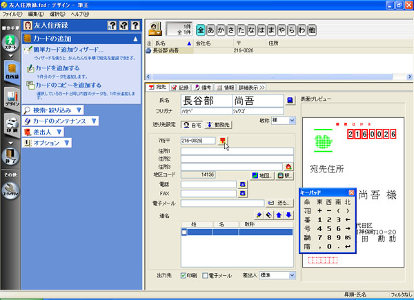 番地を入力し、必要に応じて他の項目も入力して、メニューウィンドウの[カードを追加する]をクリックします。 | ||||||||||||||||||
