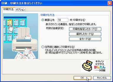 | 宛名面を印刷するには、次のように操作します。 ※ここでは、Canon製のプリンタ「PIXUS 960i」を例に解説します。なお、ドライバのインストールなどの準備はすでに終了し、プリンタが利用できる状態にあることとします。 |