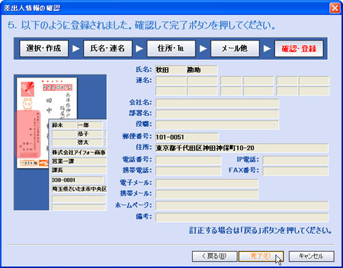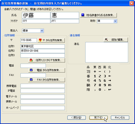 [氏名]を入力し、必要に応じて他の項目も入力して、[完了(F)]ボタンをクリックします。![]() |