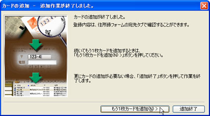 [もう1枚カードを追加(N)>]ボタンをクリックして、他の宛先を入力します。終わったら[追加終了]ボタンをクリックします。