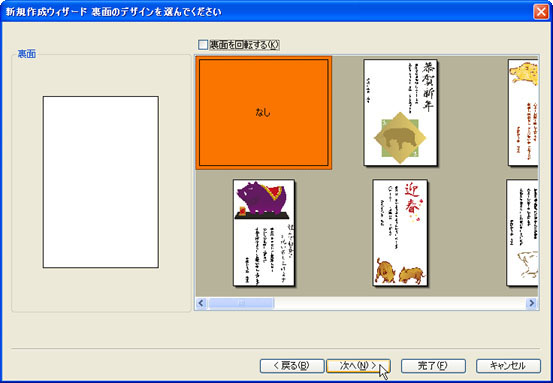 [なし]を選択して[次へ(N)>]ボタンをクリックします。横長のはがきにしたいときは、[裏面を回転する(K)]をONにします。![]() |