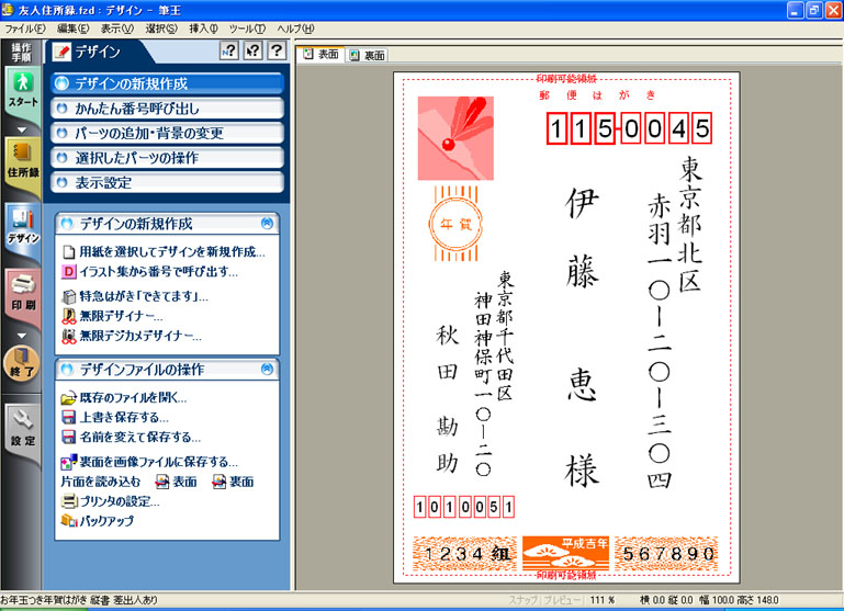 「表面」タブをクリックすると、宛名面のデザインを確認できます。![]() |