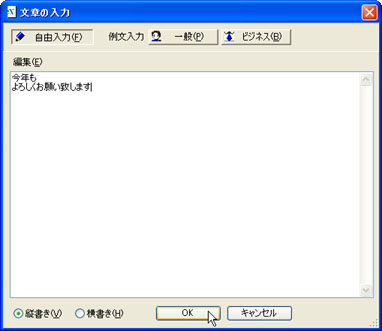 文字を入力し、[縦書き(V)]をONにして、[OK]ボタンをクリックします。![]() |